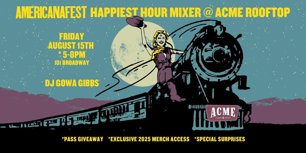 | Join us this Friday, August 15, from 5pm – 8pm for the AMERICANAFEST Happiest Hour Mixer at Acme Feed & Seed. Held on the rooftop bar, our mixer is open to the entire Americana community, members and non-members! Let us know if you’ll be there with an RSVP below. All that we ask is that you bring yourself and a good time!Plus, don’t miss the exclusive Acme x AMERICANAFEST merch collab drop, a chance to win a pair of festival passes, and of course, to hang with our amazing Americana community! DJ Gowa Gibbs will be bringing the music to the rooftop with a killer set featuring our 2025 Showcasing artists & more. |