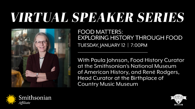 The award-winning museum, located in Historic Downtown Bristol, Virginia, is once again utilizing its affiliation with the Smithsonian Institution to kick off a new virtual speaker series set to debut on Tuesday, January 12 at 7:00 p.m. EST featuring guest speaker Paula Johnson, Food History Curator at the Smithsonian’s National Museum of American History (NMAH).