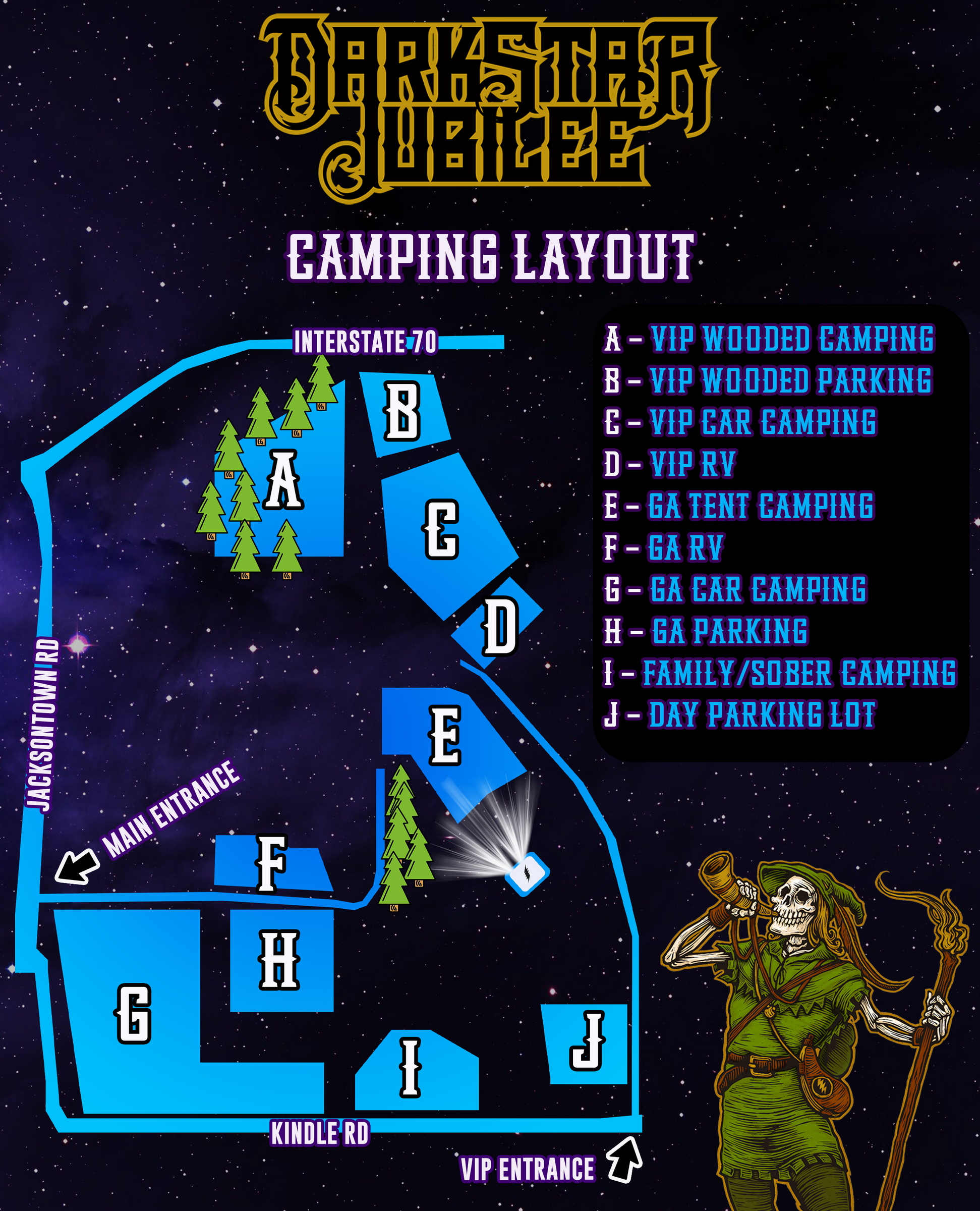 Camp Traction will set up a substance free camping area, host daily meetings within the camp site, and provide general support and traction for those who choose to experience the Dark Star Jubilee clean and sober. Register here.