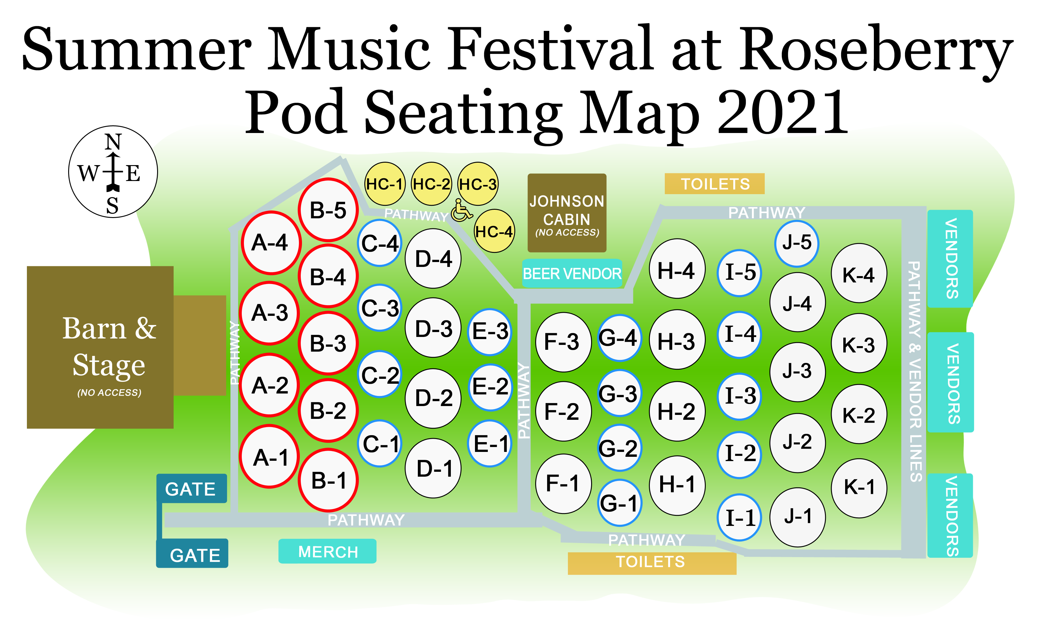 Guests can choose either a 10 person pod in a 20ft circle or a 5 person pod in a 10ft circle. These pods are sold online as a single reserved ticket for the whole pod, like choosing your seats at other seated events. You will be able to choose the pod(s) you want as they are available for each night.