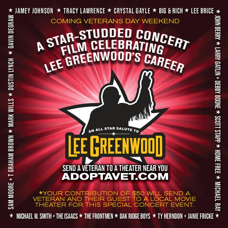 An All-Star Salute to Lee Greenwood will premiere in movie theaters on Sunday, November 12, and will include performances by Dustin Lynch, Lee Brice, Michael Ray, Michael W. Smith + The Isaacs, The Oak Ridge Boys, Tracy Lawrence, Big & Rich, Jamey Johnson, Gavin DeGraw, Scott Stapp of Creed, Crystal Gayle, Sam Moore + T. Graham Brown, Larry Gatlin + Debby Boone, Mark Wills, Home Free, The Frontmen, Ty Herndon + Janie Fricke, and more!