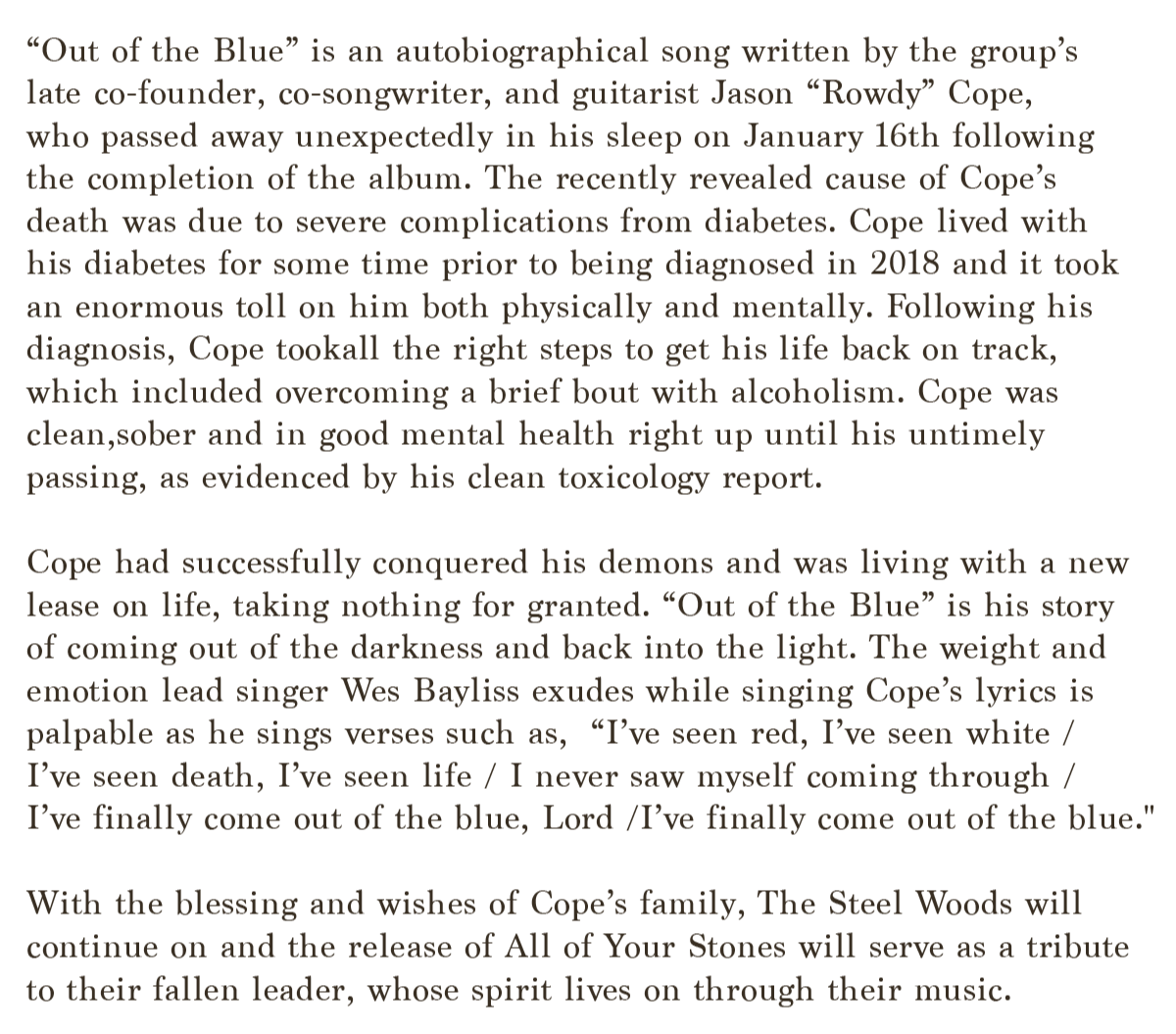 The Steel Woods have been one of my favorite live bands in the last 10 years, and they have endured more tragedy than many of their ilk. In my opinion, they are destined to become larger than life because all what they have endured would have sent other bands home crying.